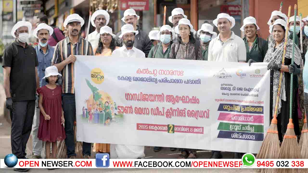 കല്പ്പറ്റ: ഗാന്ധിജയന്തിയുടെ ഭാഗമായി കല്പ്പറ്റ നഗരസഭയും കേരള ഖരമാലിന്യ പരിപാലന പദ്ധതിയും സംയുക്തമായി ടൗണ് മെഗാ ഡീപ് ക്ലീനിംഗ് ഡ്രൈവ് സംഘടിപ്പിച്ചു. നഗരസഭ ചേയര്പേഴ്സണ് അഡ്വ.ടി.ജെ ഐസക്ക് പരിപാടിയുടെ ഉദ്ഘാടനം നിര്വഹിച്ചു. ആരോഗ്യ സ്റ്റാന്ഡിങ് കമ്മിറ്റി ചെയര്പേഴ്സണ് അഡ്വ.എ.പി മുസ്തഫ അധ്യക്ഷത വഹിച്ച ചടങ്ങില് സ്റ്റാന്ഡിങ് കമ്മിറ്റി ചെയര് പേഴ്സന്മാരായ രാജാറാണി അയിഷ പള്ളിയാല്, നഗരസഭ സെക്രട്ടറി അലി അസ്ഹര്, ക്ലീന് സിറ്റി മാനേജര് കെ. സത്യന്, കെ എസ് ഡബ്ല്യു എം പി പ്രതിനിധികള് വൈശാഖ് എം ചാക്കോ, രാജശ്രീ എന്നിവര് സംസാരിച്ചു.