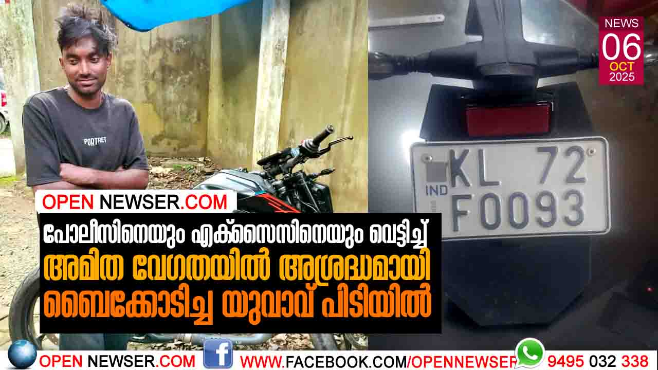 പോലീസിനെയും എക്സൈസിനെയും വെട്ടിച്ച് അമിത വേഗതയില് അശ്രദ്ധമായി ബൈക്കോടിച്ച യുവാവ് പിടിയില്