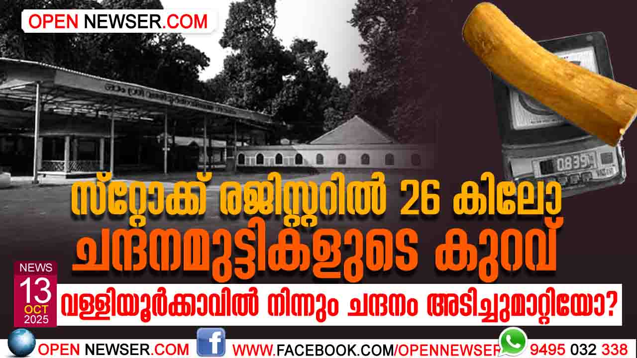 സ്റ്റോക്ക് രജിസ്റ്ററില് 26 കിലോ ചന്ദനമുട്ടികളുടെ കുറവ്; വള്ളിയൂര്ക്കാവില് നിന്നും ചന്ദനം അടിച്ചുമാറ്റിയോ ?