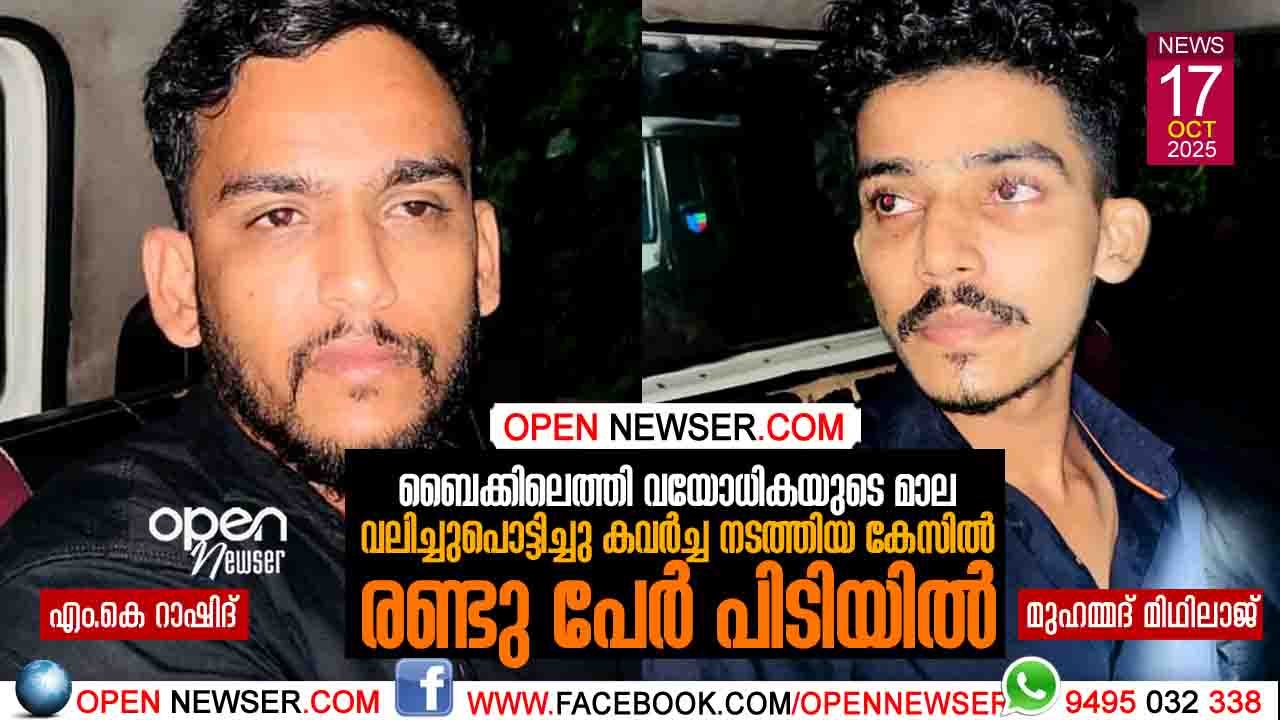 ബൈക്കിലെത്തി വയോധികയുടെ മാല വലിച്ചു പൊട്ടിച്ചു കവര്ച്ച നടത്തിയ കേസില് രണ്ടു പേര് പിടിയില്