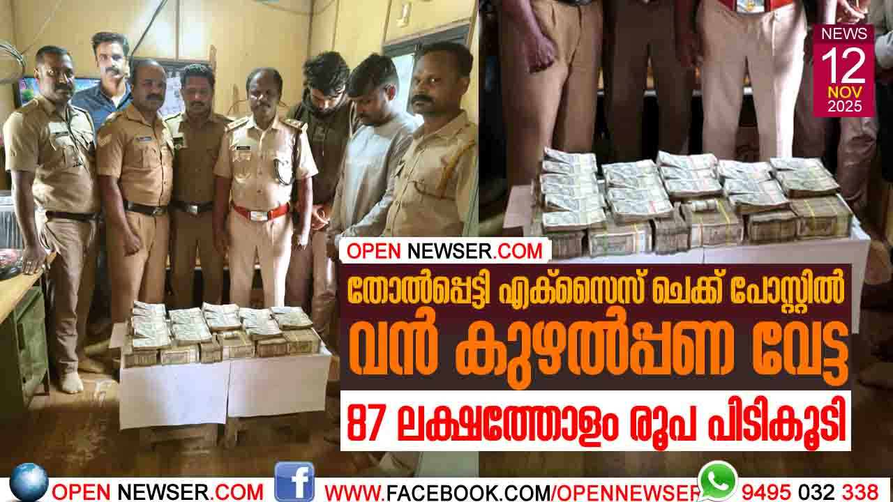 തോല്പ്പെട്ടി എക്സൈസ് ചെക്ക് പോസ്റ്റില് വന് കുഴല്പ്പണ വേട്ട; 87 ലക്ഷത്തോളം രൂപ പിടികൂടി.