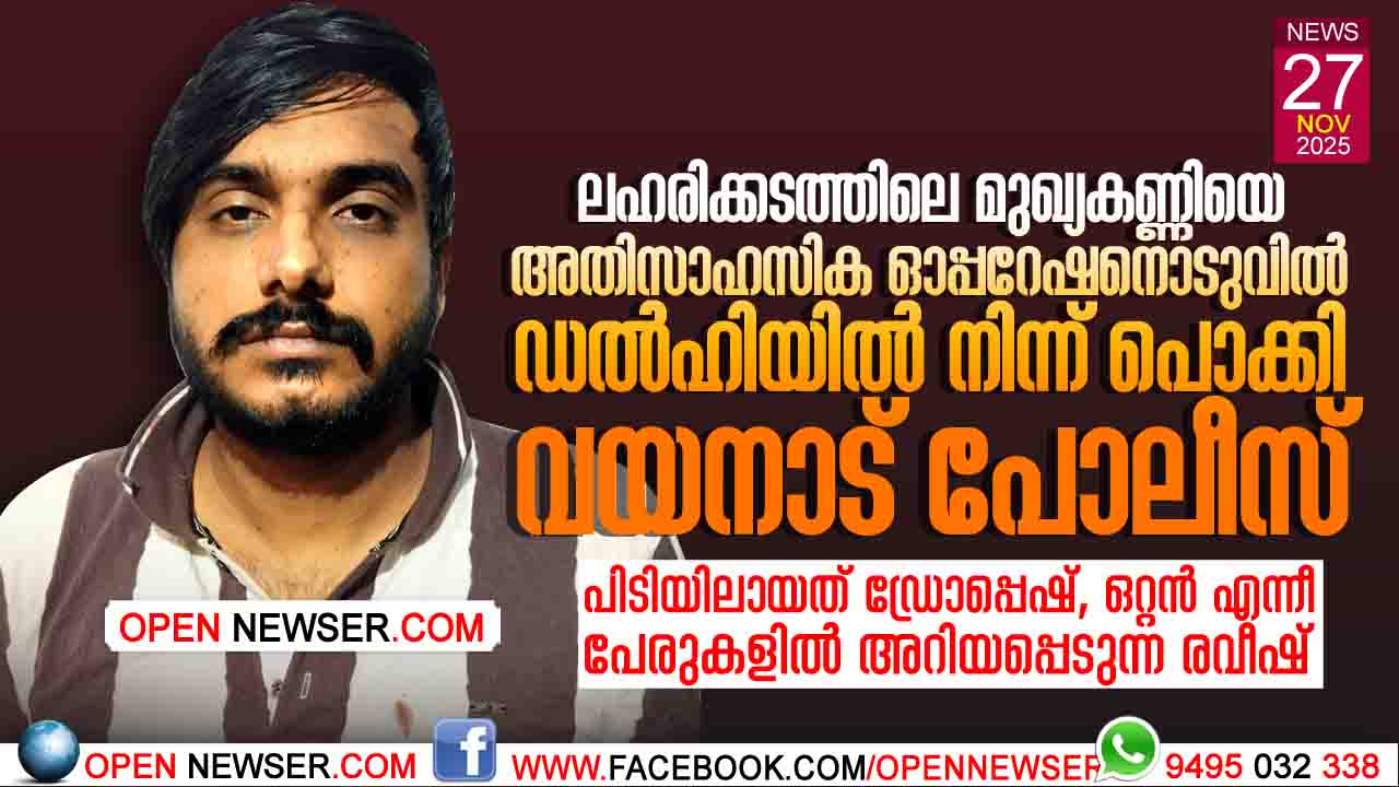 ലഹരിക്കടത്തിലെ മുഖ്യകണ്ണിയെ അതിസാഹസിക ഓപ്പറേഷനൊടുവില് ഡല്ഹിയില് നിന്ന് പൊക്കി വയനാട് പോലീസ്;പിടിയിലായത് ഡ്രോപ്പെഷ്, ഒറ്റന് എന്നീ പേരുകളില് അറിയപ്പെടുന്ന രവീഷ്