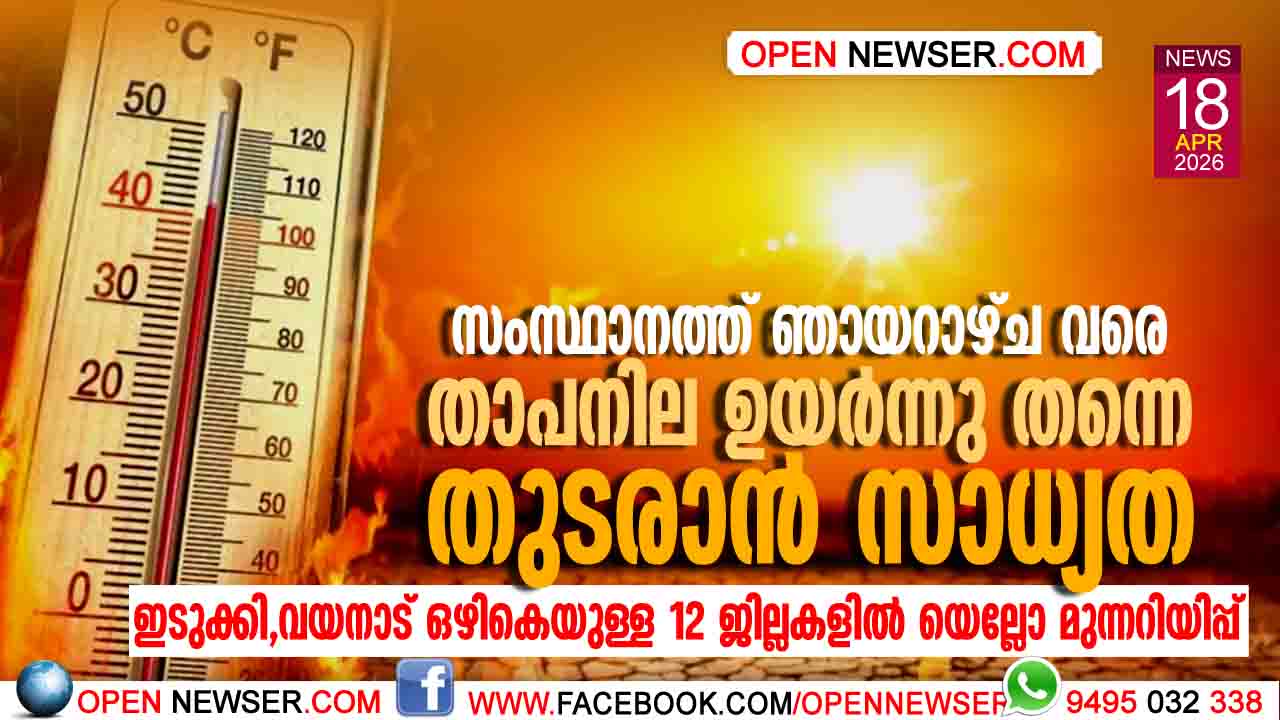 സംസ്ഥാനത്ത് ഞായറാഴ്ച വരെ താപനില ഉയര്ന്നു തന്നെ തുടരാന് സാധ്യത; ഇടുക്കി, വയനാട് ഒഴികെയുള്ള 12 ജില്ലകളില് യെല്ലോ മുന്നറിയിപ്പ്
